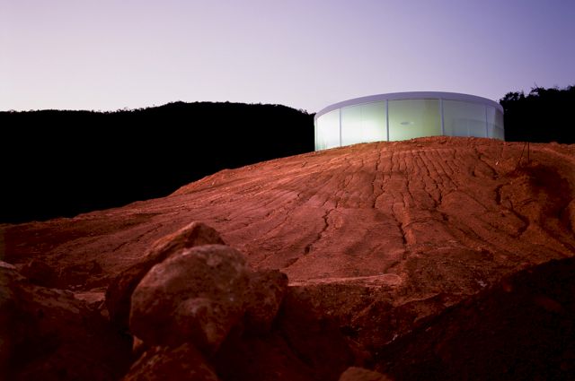 We begin with Doug Aitken. His Sonic Pavilion (2009), which is located on top of a hill, is an ethereal empty circular space made out of glass and steel, where you can listen to the sound of the earth breathing in real time, transmitted by highly sensitive microphones installed at a depth of 200 meters below the ground, and emphasized by sound amplification equipment. If you lay down on the wooden structure you can actually feel the sound waves penetrating your body – a soothing and intangible experience.